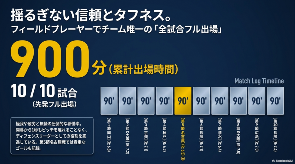 移籍初年度、24歳、しかも期限付き。「試されている」立場でこの結果は、言葉より重い。監督が「お前じゃないとダメだ」と判断し続けた10試合分の信頼が、この数字に凝縮されている。
