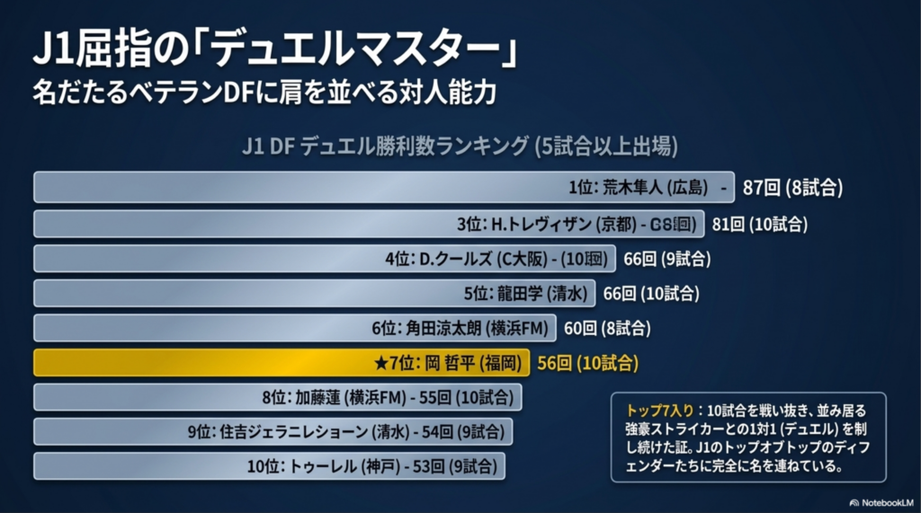 2026シーズンのJ1公式戦、デュエル勝利数のランキングを出すと岡哲平はDF121人中**7位(56回)**に入ってくる。上にいるのは広島の荒木隼人(87回)、名古屋の藤井陽也(81回)といった名前が並ぶ。正直、そうそうたるメンバーだ。