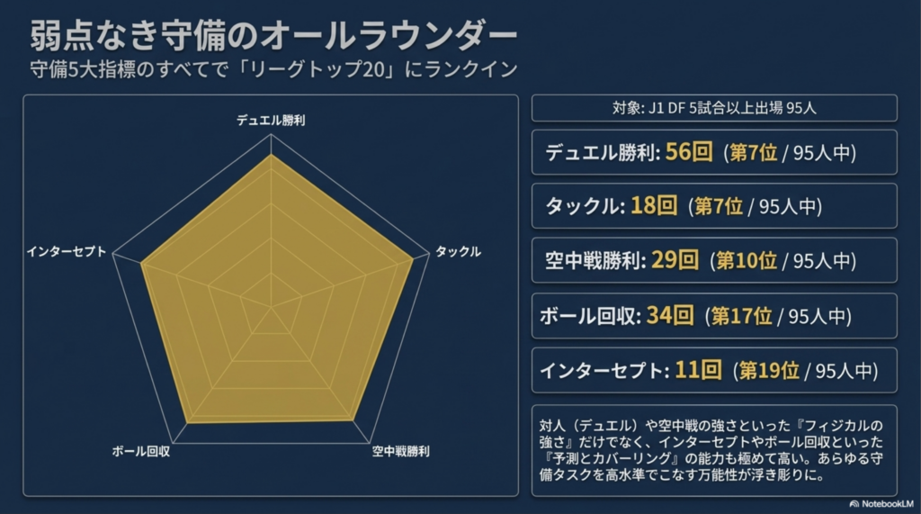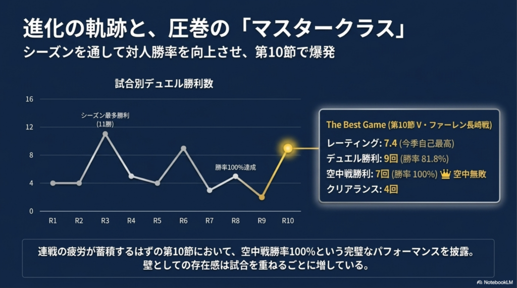 そして今シーズン最高のパフォーマンスは、おそらく第10節・V・ファーレン長崎戦だろう。デュエル9勝(勝率81.8%)、空中戦7勝(勝率100%)、レーティング7.4(Sofa scoreより)。90分間、一度も空中戦で負けなかった。この数字を見たとき、正直、ちょっと笑ってしまった。強すぎる。