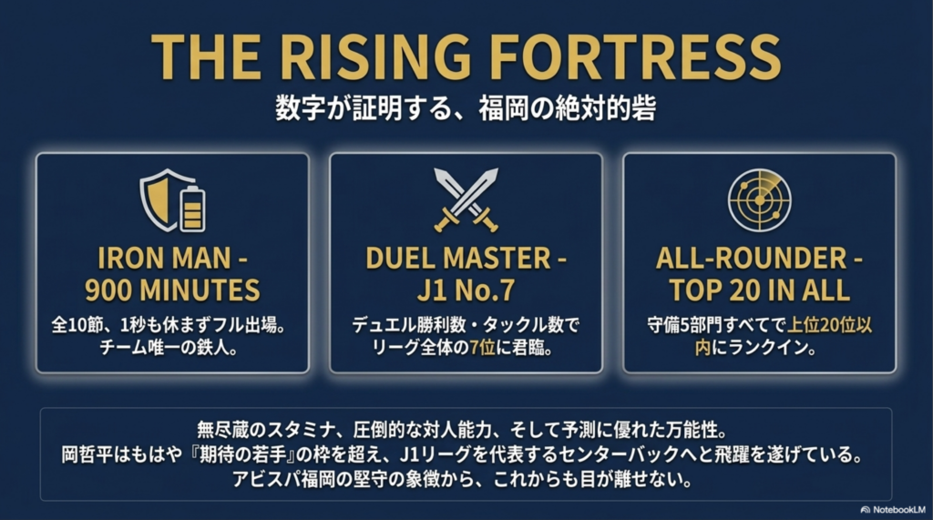 シーズン最多デュエルを記録したのは第3節・京都サンガ戦。この日の岡は1試合でデュエル11勝(勝率78.6%)、タックル5回という数字を叩き出している。京都のプレッシングに対して逃げるでも跳ね返すでもなく、正面から競り続けた。その結果が勝ち点3に繋がったのは間違いない。